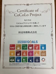 田辺米穀株式会社は、このたび「COCOLOプロジェクト」に認証されました。