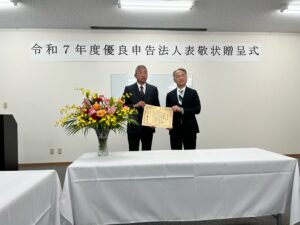 贈呈式では、税務署長より表敬状を賜り、当社代表より今後も適正申告の徹底と地域社会への貢献に取り組む旨の挨拶を申し上げました。